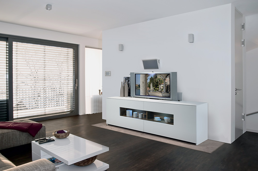 Anta complanare, particolare anta a ribalta del vano televisore con apertura e chiusura automatiche, telecomando per la salita e la discesa del televisore.